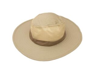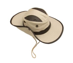 Sombrero modelo Australiano, Gabardina de Algodón con poliéster, aplicaciones tipo piel. Broches laterales. Cordón de Seguridad.